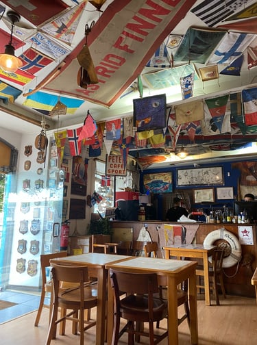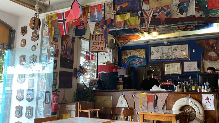 Tijdens onze reis was het EK voetbal in volle gang. Zo kwamen we terecht in Peter's Sport Café, een begrip onder zeilers. In het café hangen alle vlaggen van zeilboten die op Horta hebben aangemeerd. Het is een gezellige knusse kroeg, die zeker een bezoekje waard is als je op Horta bent! Extra leuk natuurlijk als er leuke sportwedstrijden worden uitgezonden.